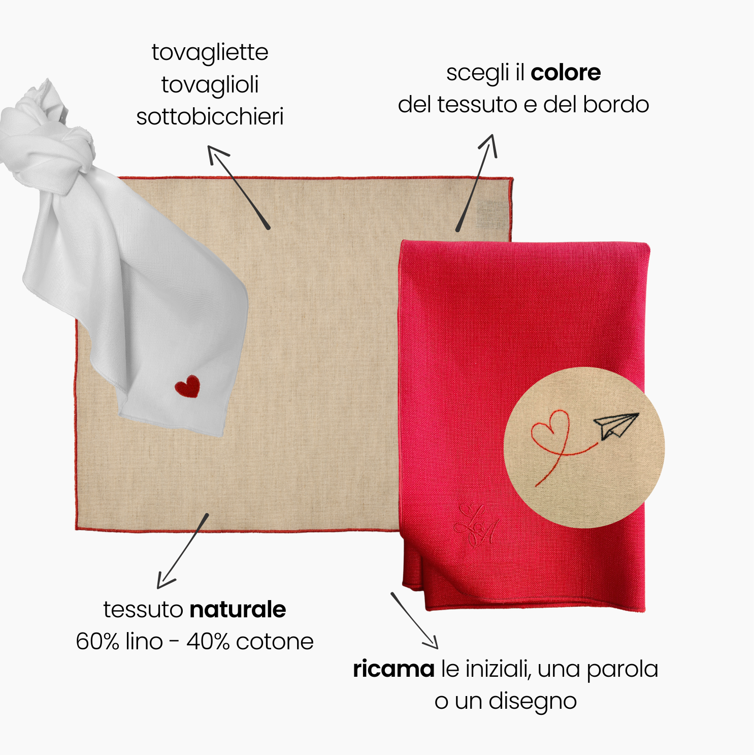 Tovagliette, tovaglioli e dettagli tessili fatti a mano, da personalizzare con iniziali, cuori o simboli che vi rappresentano. Un gesto semplice ma pieno di cura: perché certe cose non sono solo per una cena… ma per restare, ogni giorno, sulla vostra tavola.