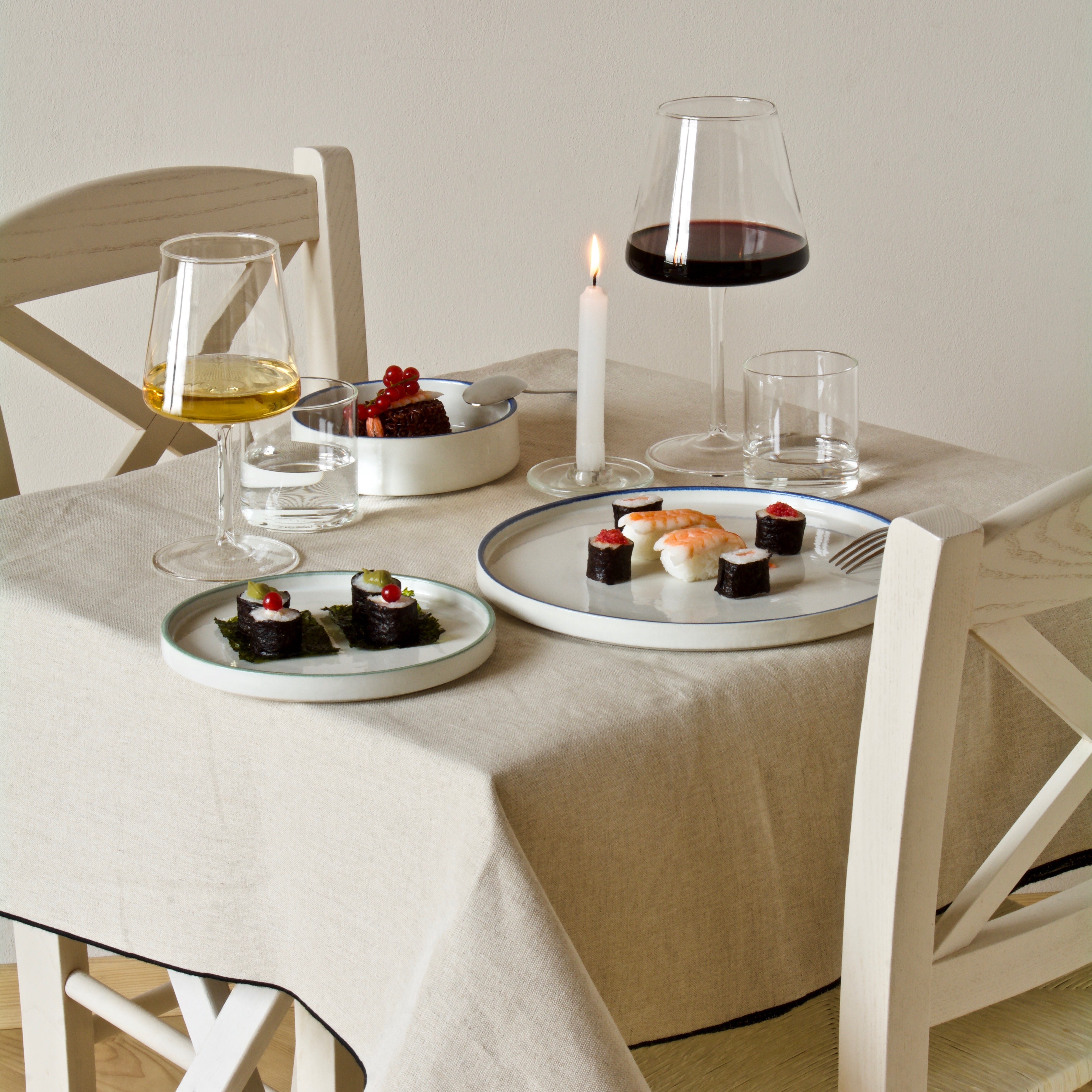 La linea concettualmente richiama le linee che sono il filo conduttore del progetto: dritte, essenziali e senza fronzoli. Abbiamo prestato molta attenzione alle proporzioni delle forme tra i vari prodotti sacrificando volutamente la praticità dell’oggetto arrivando a proporre un posto tavola dove le forme sono protagoniste.