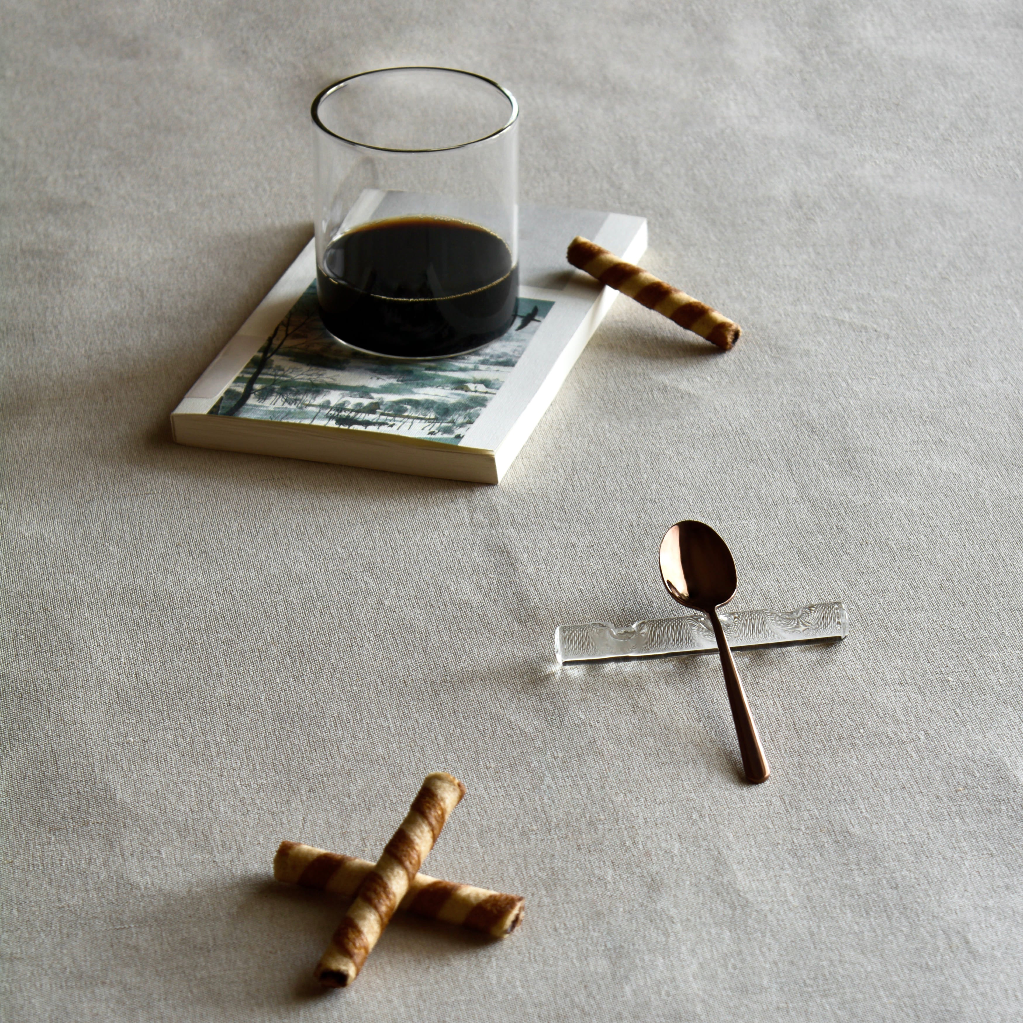 Ogni accessorio in vetro è realizzato a mano nel veneziano, senza l'utilizzo di stampi o dime. Questo processo manuale conferisce unicità a ciascun pezzo e permette di ottenere articoli con lievi differenze nelle dimensioni e nelle forme, caratteristiche tipiche dei prodotti artigianali. La cannuccia ed il cucchiaino, con un punto di vetro colorato, sono l'espressione della ricerca del dettaglio nel dettaglio. Mentre il poggiaposate diventa un prezioso dettaglio invisibile ma essenziale.