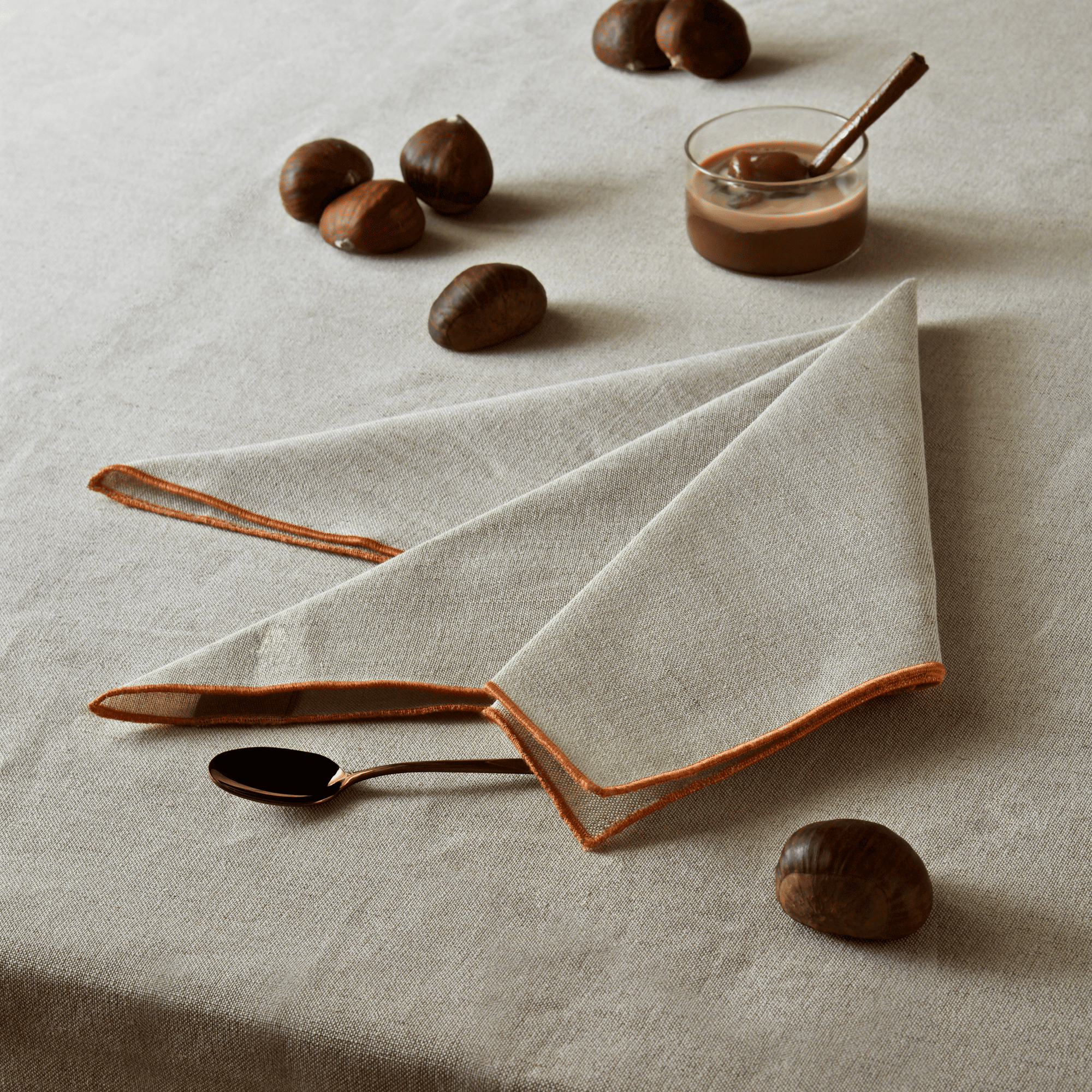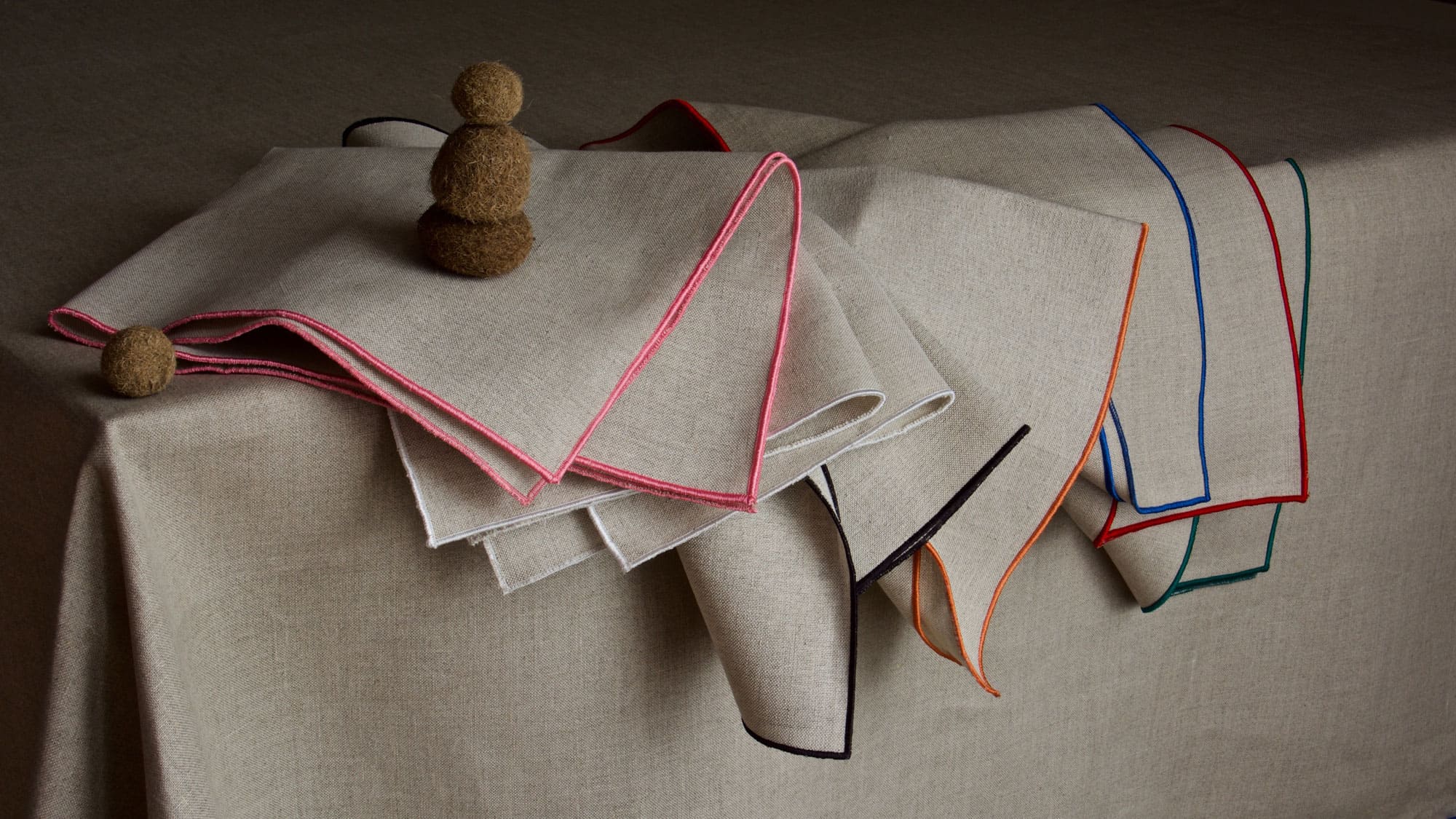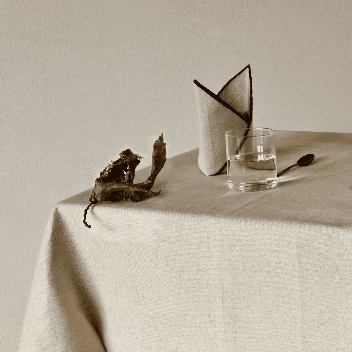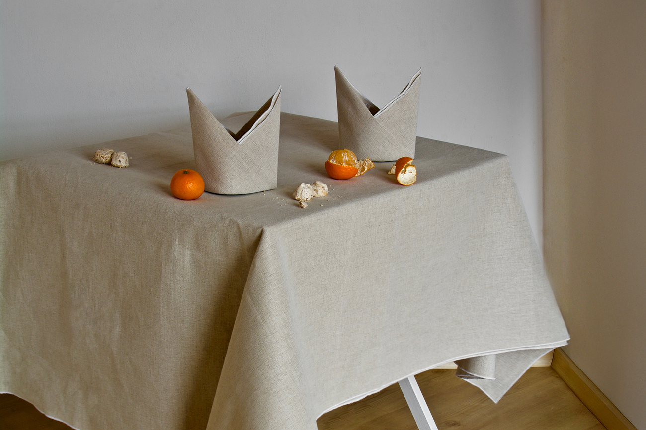 Si chiacchierava del più e del meno a fine pranzo, soddisfatti di aver concluso i discorsi di lavoro. Le conversazioni si sono fatte leggere, e con la mente siamo tornati alle vecchie storie di famiglia, a come e dove siamo cresciuti, alle nonne e a ciò che accadeva in quelle case. Abbiamo scelto la tovaglia per dare forma a quei ricordi, semplici ma indelebili: tessuti grezzi che richiamano tempi passati, ma sempre presenti in noi.