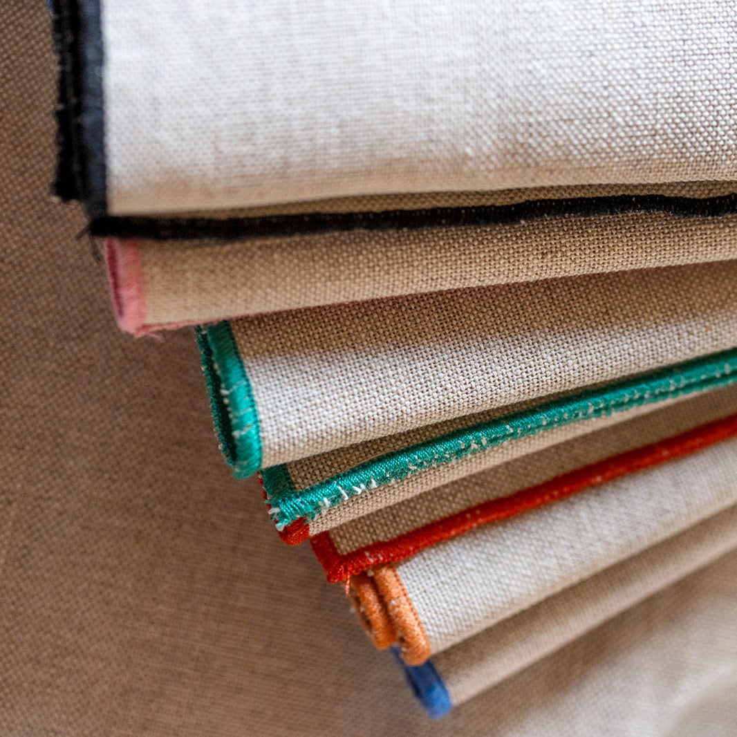 Il tessuto è un elemento intrinseco della terra che ci ospita, e la materia prima che abbiamo scelto è naturale e prodotta da una manifattura locale biellese. La scelta del lino per questa linea rende il prodotto parte integrante della tradizione e della storia del territorio: un materiale dalla consistenza e resistenza uniche, completamente naturale e quindi "vivo". L’intera linea viene orlata artigianalmente in sette diverse colorazioni.